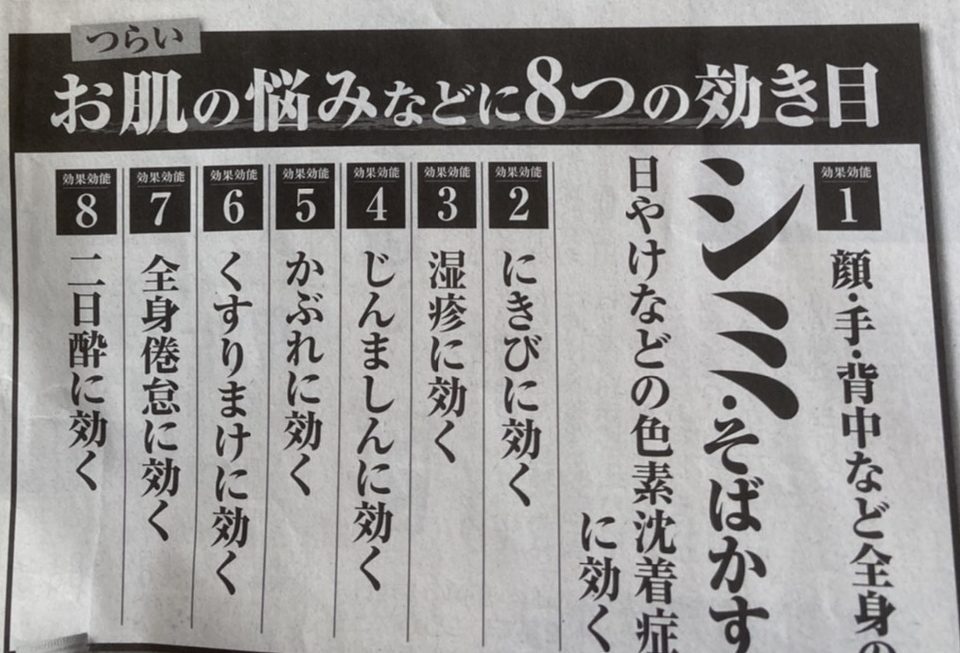 シミやそばかすに効くのと二日酔いに効くの振り幅が大きすぎて、唐突感が大き過ぎるのです。もはや、違和感。