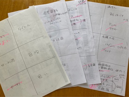 最終ページまで、全体の流れを作り終えたら、次は各ページに必要なデータや素材を揃えます。データを揃えていくうちに追加したい情報もでてくるでしょう。必要に応じて、下書きに追加する情報を赤字で書き入れていきます。
