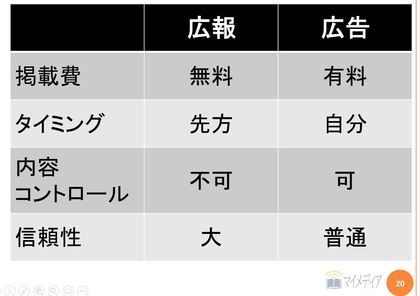 今日は「広報と広告の違い」についてお話しいたします。なぜこのテーマを選んだかというと、先日インターネットを検索していた時、プレスリリースについて「無料でメディアに掲載できる広告!?」と説明している記事を見かけたからです。