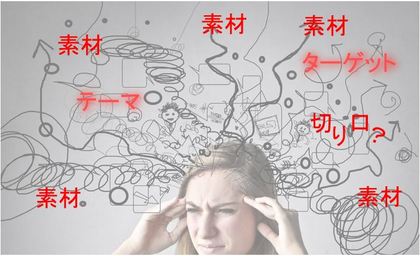 頭の中にもやもやが広がり、素材が点在しています。テーマとターゲットは、ボヤっとしていて、切り口も定まっていません。