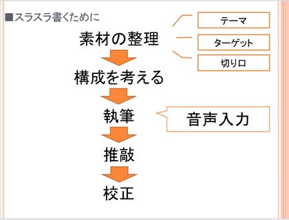 書き出す前の素材の整理、テーマやターゲットを絞ること、構成を考えること。こうした事前の作業が重要です。それらができていないと書こうとしても、全く書けない状態に陥ってしまうのです。