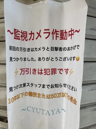 当店では防犯のため、私服警備員が巡回しておりますが、お客様におかれましてもお手回り品や貴重品には充分ご注意ください。
