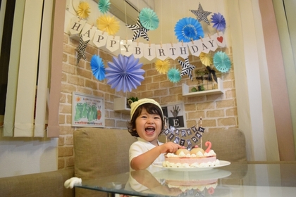 女の子の頭上には、HAPPYBIRTHDAY❤が1文字ずつ描かれたペナントと、青や黄色の紙飾り、黒と白のストライプの星がにぎやかに飾られている。部屋の中は、パステルを基調とした優しい雰囲気。女の子は大きなソファーの真ん中に座って、黄色い帽子をかぶってる……