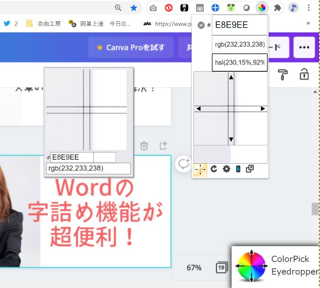 私は、ブラウザにchromeを使っているので、拡張機能に「ColorPick Eyedropper」を入れてあります。このツールを使うと、PC上のカラーを調べることができるのです。